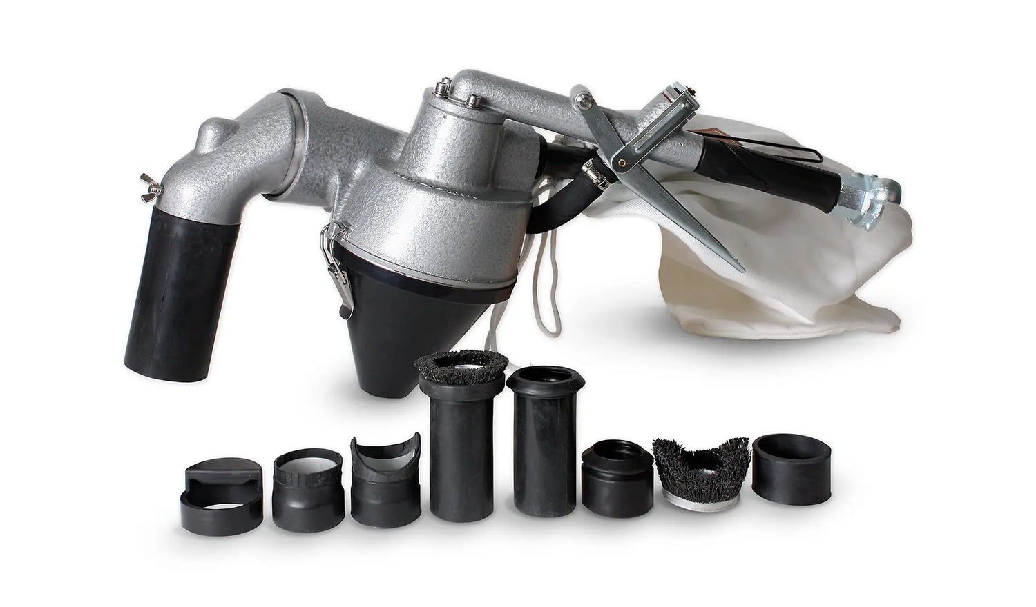 Les abrasifs sont stockés dans une trémie conique compacte, d'où ils sont dosés dans l'appareil de sablage. L'abrasif est aspiré dans la chambre de mélange de l'Educt-O-Matic par le flux d'air à grande vitesse, où il est mélangé à l'air avant d'être expulsé par la buse de projection. La buse de sablage est réglable et rotative, ce qui permet un sablage sous n'importe quel angle. L'abrasif et la poussière sont recueillis dans l'accessoire en caoutchouc. L'abrasif réutilisable va dans la trémie, tandis que l'abrasif fin et la poussière sont évacués dans le sac à poussière. L'Educt-O-Matic permet de traiter facilement une surface d'environ 30 mm de large. Lorsque vous avez terminé le sablage, relâchez la gâchette à mi-course pendant deux à trois secondes, et l'aspirateur aspire la poussière et l'abrasif restants. L'aspiration s'arrête en relâchant complètement la gâchette. L'Educt-O-Matic fonctionne le mieux avec des grenailles d'acier ou de fer. La poussière et les abrasifs fins sont recueillis dans un sac en coton.