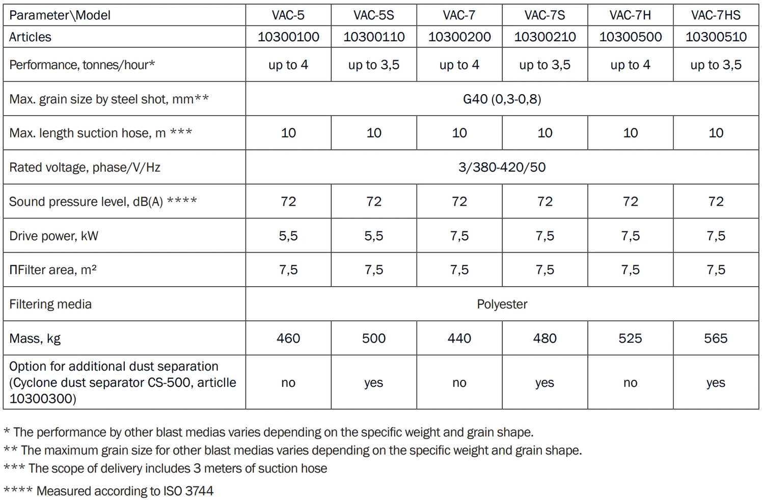 • VAC-7HS: A combination of the features of the VAC-7H and VAC-7S. This system includes both the pre-separator (SC-500) and the free-standing storage container of 0.3 m³, minimizing dust formation while offering flexibility in abrasive reuse or disposal.
