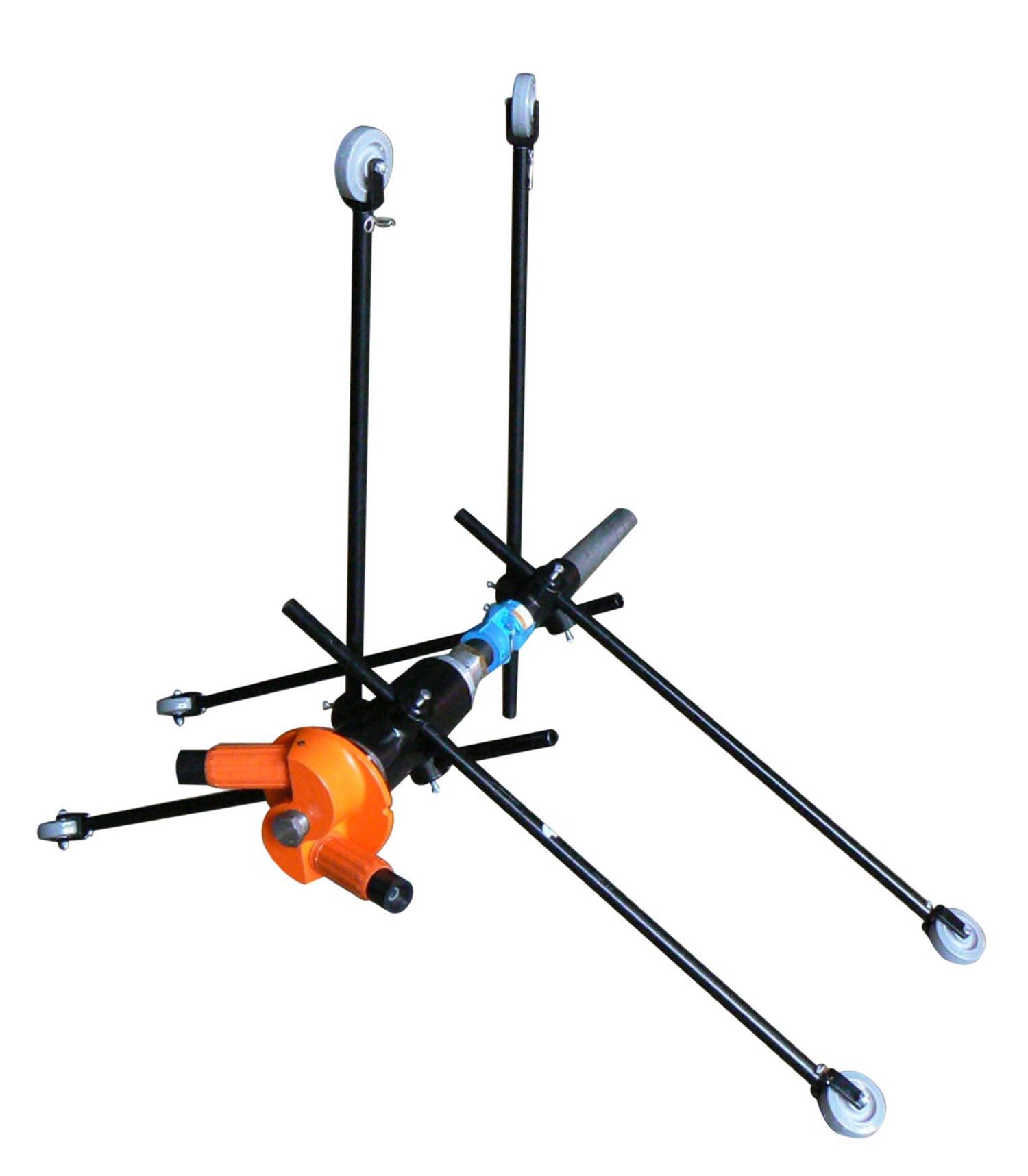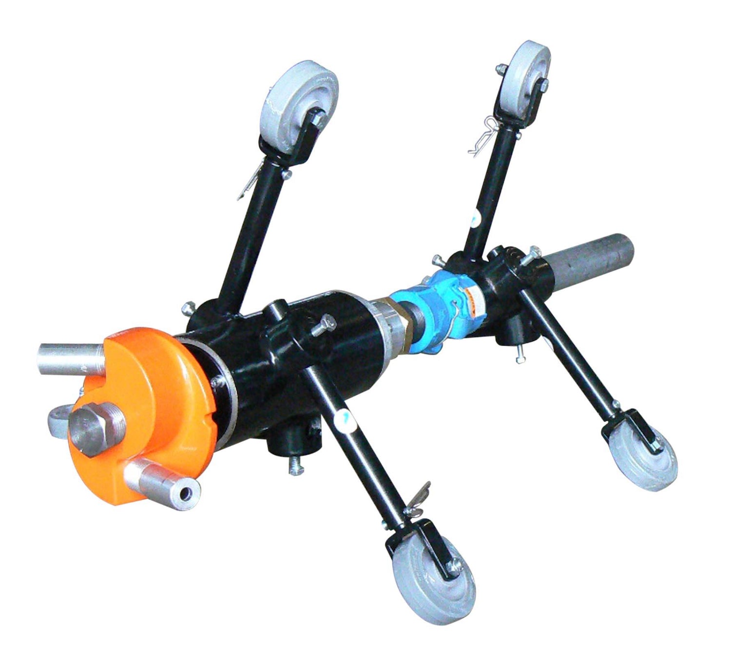 The PanBlast™ Tornado internal pipe blasting tool is designed to clean the internal surfaces of pipes from 200 mm (8") to 900 mm (36") I.D. or optionally up to 1525 mm (60") I.D. with the use of the 50 mm(2") nozzle head and large carriage system. The tool is driven by the blast air supplying the two nozzles in the rotating blast head.