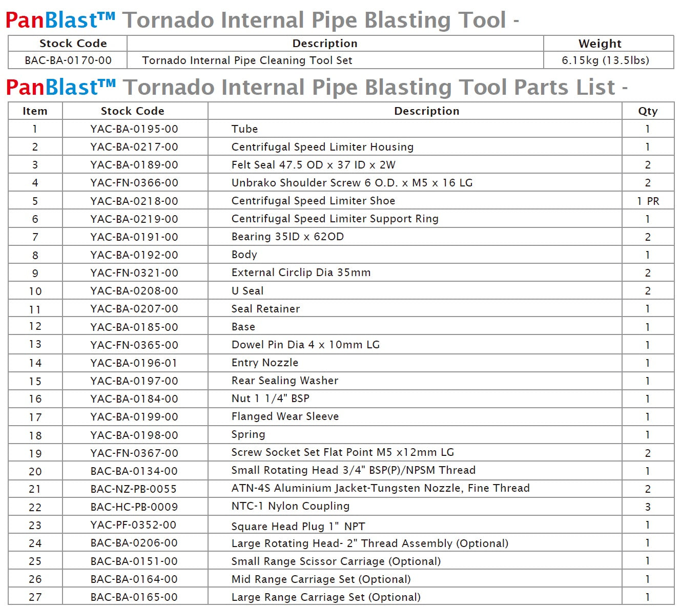 • The PanBlast Tornado pipe blasting tool comes standard with a rotating blast head suitable for 2 nozzles with 19 mm thread (3/4")